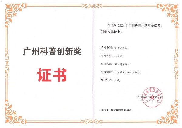 为调动科普工作者的积极性和创造性,推进广州科普事业的发展,广州市科技进步基金会设立广州科普创新奖。6月10日获悉,2020广州科普创新奖共评出奖项30项,其中“科普杰出人物奖”2项,“科普贡献奖(组织)”6项,“科普贡献奖(个人)”9项,“科普成果奖”13项。由华南植物园园艺中心副主任廖景平首创,王曦、李碧秋、黄瑞兰、宋政平、夏汉平等共同策划与组织实施的“琪林科学讲坛”系列科普讲坛活动荣获“科普成果奖”。