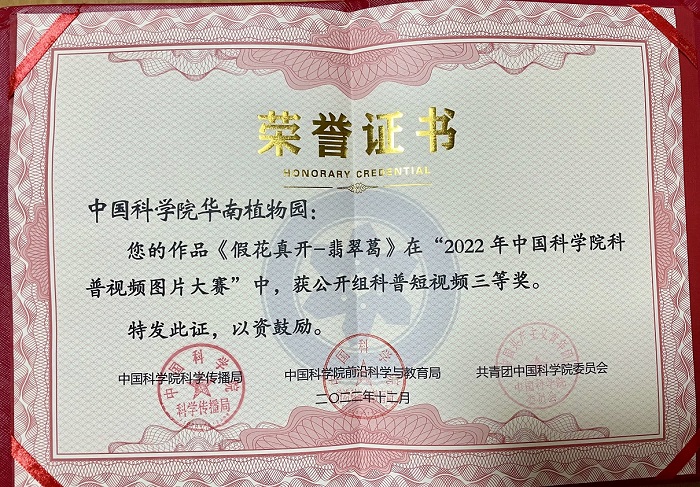 华南植物园园艺中心策划拍摄的科普短视频《假花真开-翡翠葛》荣获公开组科普短视频类三等奖。