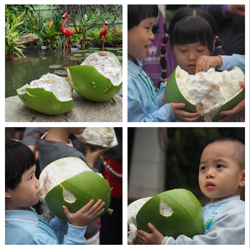 孩子们带着好奇的目光,继续前往温室群景区探秘植物精灵,这里的奇花异草,数不胜数,让人应接不暇。原来大自然中有这么多神奇的植物!与此同时,老师还组织小朋友们拾拣种子、落叶和落花等,通过搜集自然物,调动视觉、听觉、嗅觉、触觉来观察自然,让小朋友们对植物的叶、花、果、种子有初步的印象。探秘植物精灵过程中,孩子们还收获特别的馈赠,一个裂开的铁西瓜,树上的西瓜能吃吗?瓜里是什么样子的?孩子们爱不释手,轮流观察。专注的时光总是跑得飞快,到达旅程终点,小朋友们纷纷展示出自己搜集的自然物,互相观摩和分享。