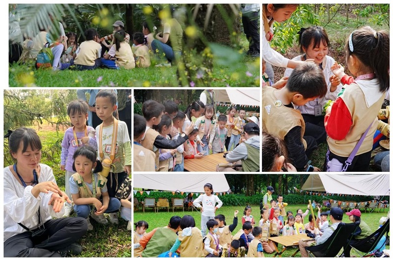他们分成小队,以一场“植物密语”的游戏拉开序幕。踏着轻盈而谨慎的步伐,孩子们深入这片未知的密林。在这里,每一步都充满了新奇和未知。在老师们的引领下,他们用眼睛观察着那些色彩斑斓的花朵和奇异的叶片;用鼻子闻到空气中混合着泥土、树脂与野花的清新香气;用耳朵聆听着鸟儿的歌唱和树叶的低语;用小手触摸到树干的粗糙,苔藓的柔软以及落叶的轻盈。他们仿佛成为了这片密林的一部分,与周围的一切息息相关。每一步深入,孩子们对大自然的了解都有所增加,令后续密林探险之旅更加充满信心。