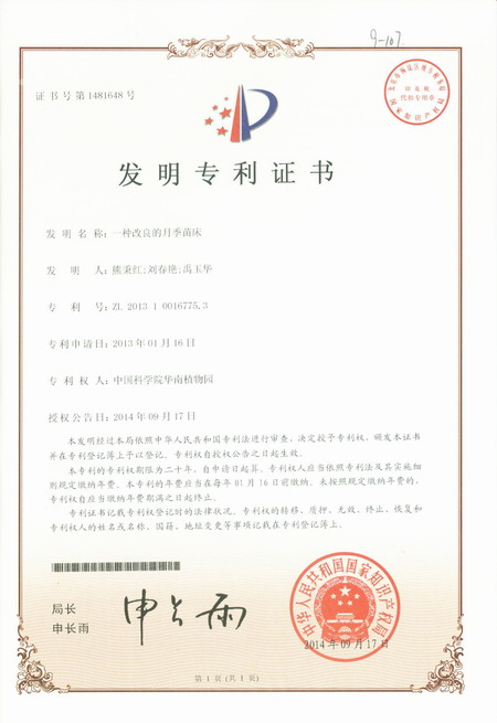 10月8日收悉,由华南植物园熊秉红等科研人员完成的“一种改良的月季苗床”获得国家发明专利授权(专利号:ZL 201310016775.3)。