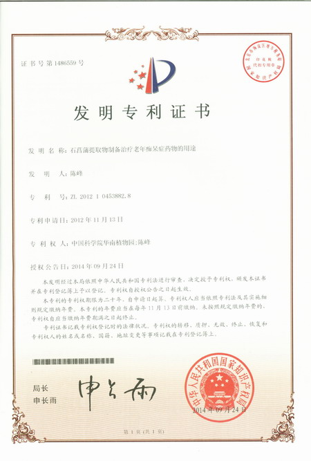 10月17日收悉,由华南植物园陈峰研究员完成的“石菖蒲提取物制备治疗老年痴呆症药物的用途”获得国家发明专利授权(专利号:ZL 201210453882.8)。