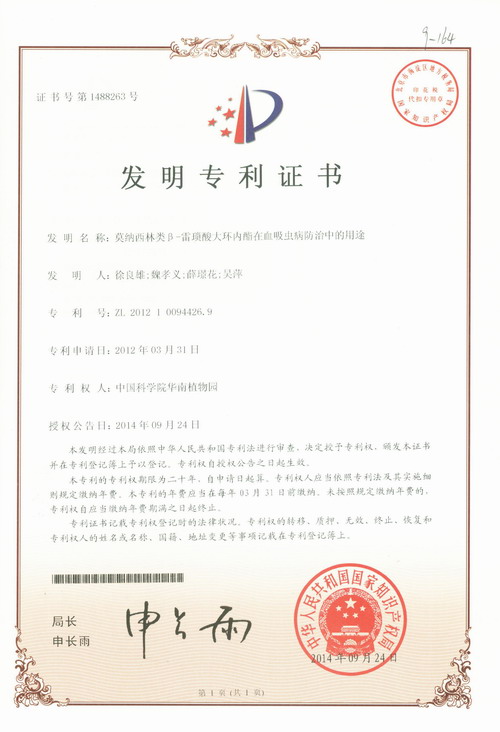 1029收悉,由华南植物园徐良雄、魏孝义等科研人员完成的莫纳西林类β-雷琐酸大环内酯在血吸虫病防治中的用途获得国家发明专利授权(专利号:ZL 201210094426.9)。