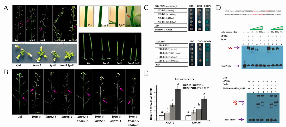 中科院华南植物园刘勋成博士指导研究生赵明磊在模式植物拟南芥花序结构发育的转录调控机制中取得重要研究进展。观察发现,与野生型的拟南芥植物相比,染色质重塑因子BRAMHABRM)与BP的缺失突变体的表型相似,均呈现出相对下垂的角果、短小的果柄和紧密的花序等表型,而BRMBP的双突变体呈现更为显著的发育缺陷,揭示BRMBP可能位于同一信号途径中调控花序结构的发育过程(图A)。遗传学分析显示,在BRM的突变体中同时敲除KNAT2KNAT6两个基因后,植物可恢复到正常的花序形态,表明BRM在遗传关系上位于KNAT2KNAT6基因的上游(图B)。同时,体内和体外的分子生物学研究显示,BRMBP在植物体内通过蛋白相互作用形成复合体(图C),共同结合于下游基因KNAT2KNAT6位点上(图D),并通过降低组蛋白甲基化(H3K4me3)的水平,改变染色质的状态,从而抑制其表达(图E)。