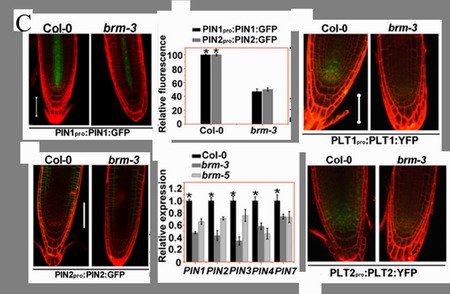 Figure C.BRM突变体中,PIN1,PIN2,PLT1 和PLT2基因表达受到抑制。