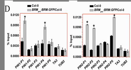 Figure D.BRM直接结合在基因PIN1和PIN2上。