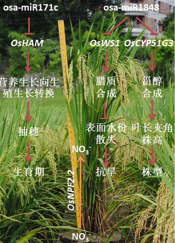 图:OsNPF2.2负责NO3-从根向上运输; osa-miR171c调节 OsHAM表达影响水稻生育期;osa-miR1848调节腊质合成酶基因OsWS1表达影响抗旱能力,同时调节甾醇合成途径中的OsCYP51G3基因表达影响水稻株型。