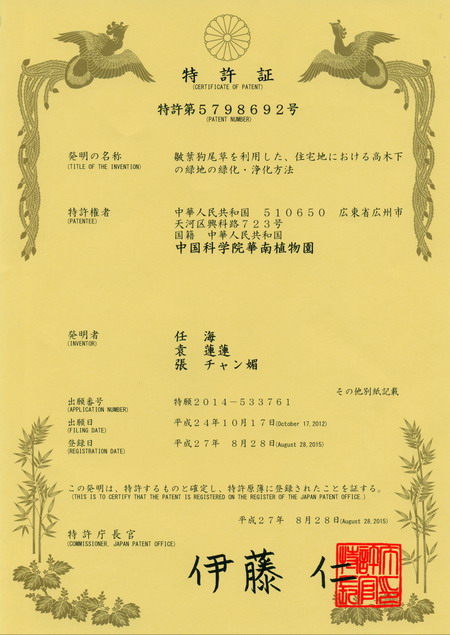 10月29日获悉,由中科院华南植物园任海研究员等科研人员完成的“一种利用皱叶狗尾草绿化和净化住宅小区乔木下绿地的方法”获得日本授权(专利号:5798692)。该专利已于2013年获中国发明专利授权(专利号:ZL201210333138.4)