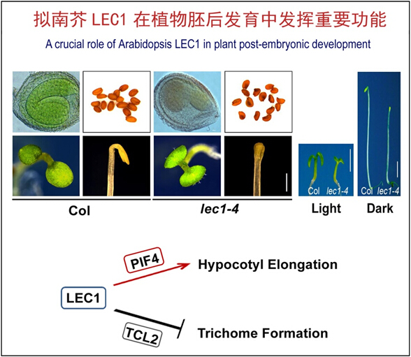 中科院华南植物园植物激素调控研究组黄铭坤博士在侯兴亮研究员的指导下,发现拟南芥LEAFY COTYLEDON1(LEC1)在调控植物胚后发育中发挥重要作用。LEC1是植物胚胎发育的关键调控因子,LEC1突变会造成植物多重表型,包括胚胎发育缺陷、下胚轴缩短、异常的子叶形态以及种子萌发率下降等等。下胚轴是研究胚后发育的一个普遍模式系统,利用分子生物学手段他们找到了LEC1的互作因子,bHLH转录因子PIF4蛋白。研究发现,LEC1和PIF4存在直接的相互依赖关系,并且能够共同结合到下胚轴伸长相关基因如IAA19、YUC8的启动子G-box元件上,协同调控下胚轴的伸长。此外,研究也揭示了LEC1通过调控毛状体发育相关基因的表达以及招募转录因子TCL2等来抑制子叶毛状体的发育。这些研究成果明确了LEC1在植物胚后发育过程中的重要角色,同时也增强了对LEC1参与植物发育调控的功能认知。