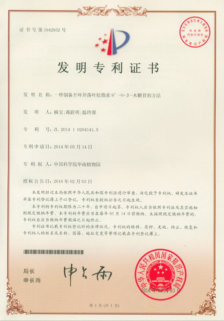 3月3日获悉,由中科院华南植物园杨宝、蒋跃明等科研人员完成的“一种制备开环异落叶松脂素9’-O-β-木糖苷的方法”获得国家发明专利授权(专利号:ZL 201410204141.5)。