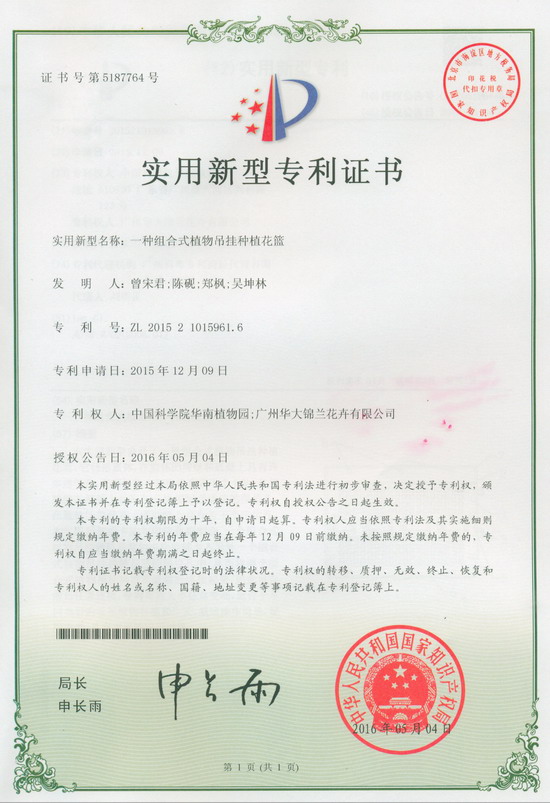 7月1日获悉,由中科院华南植物园曾宋君研究员等科研人员完成的“一种组合式植物吊挂种植花篮”获得实用新型专利授权(专利号:ZL 201521015961.6)。