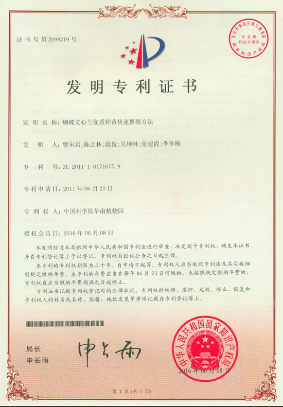 7月4日获悉,由中科院华南植物园曾宋君研究员等科研人员完成的“蝴蝶文心兰优质种苗快速繁殖方法”获得发明专利授权(专利号:ZL 201110171675.9)。