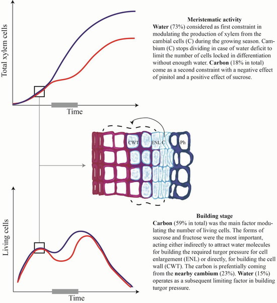 中科院华南植物园森林生态与模拟研究组黄建国研究员及其合作者通过研究在不同温度和水分处理下黑云杉幼苗树干形成层每周细胞分裂和木质部形成以及测量形成层和木质部中的非结构碳组分(蔗糖sucrose,葡萄糖glucose,果糖fractose,棉籽糖raffinose和D-松醇d-pinitol)的含量,用混合模型定量了非结构碳,水分和温度与形成层和木质部细胞数量的关系,发现表征分生组织活动的木质部细胞总数(木质部增大期细胞、细胞壁增厚期细胞、成熟细胞)是水分,蔗糖,和D-松醇的函数(conditional r2 =0.79),其中水分为主要限制因子(贡献率73%),碳次之(贡献率18%);发现形成层在干旱状态下会停止细胞分裂。而碳(其中23%的碳来自附近的形成层)则是活细胞总数(形成层细胞、增大期细胞、细胞壁加厚期细胞)的最大解释因子(conditional r2 =0.49;贡献率59%),水则次之(贡献率15%),表明木质部发育过程中对能量的功能性需求。该研究首次精细区分了碳和水在木质部形成(包括分生组织活动和细胞分裂)中的交互作用及阐明了干旱抑制树木生长及死亡的生理机制。