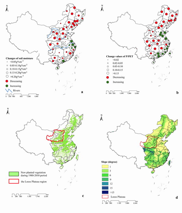 图:(a)表层土壤水分近30年变化趋势;(b)综合气候因子(降雨/潜在蒸散力)近30年变化趋势;(c)近30年新增绿地面积分布;(d)坡度图。