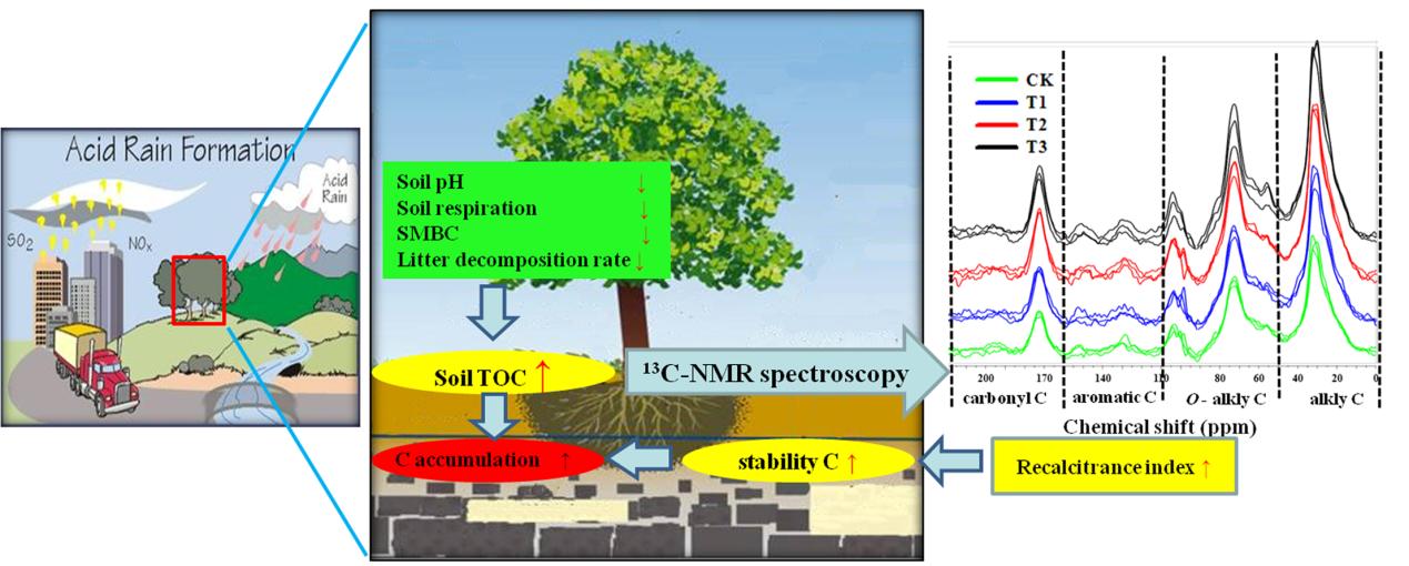 研究结果表明,持续的模拟酸雨将使土壤酸化不断加剧,减缓凋落物的分解速率,抑制土壤呼吸排放,降低土壤微生物活性及根系生物量,从而有利于土壤有机碳的累积。同时,利用核磁共振技术分析表明,土壤不断的酸化使得土壤表层难分解的有机物质增加,有机碳稳定性更高,更有利于森林土壤有机碳长期的积累。