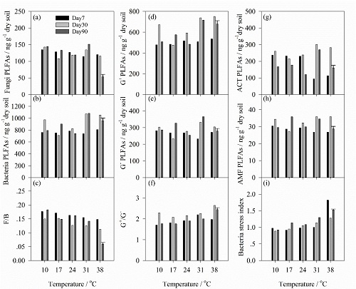 图1. 温湿度对土壤微生物群落PLFA影响室内培养实验