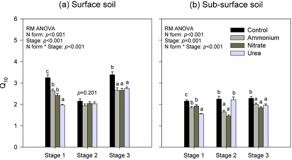 图. 不同培养阶段表层(a)和亚表层(b)土壤微生物呼吸的温度敏感性对不同形态N添加的响应
