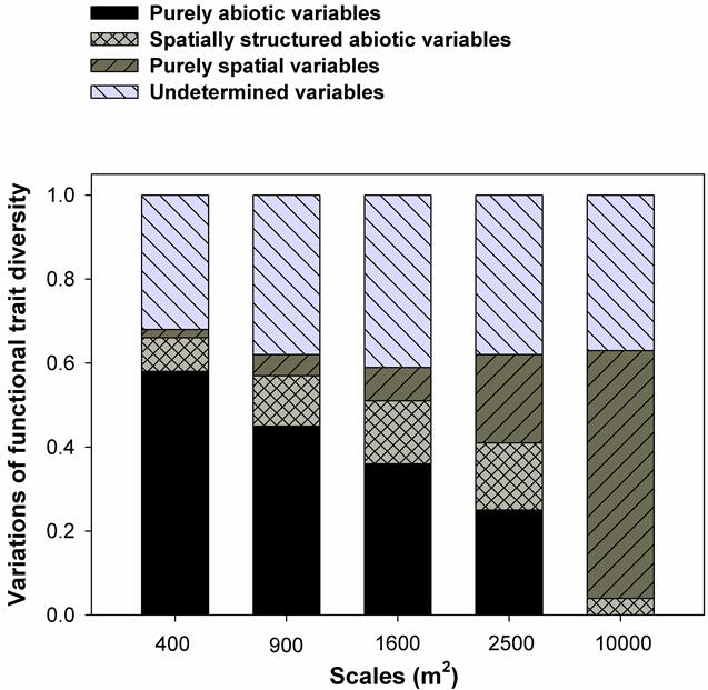 图:鼎湖山大样地不同空间尺度上优势木本植物功能性状变异的方差分割。