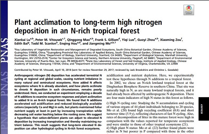 5月1日,美国《国家科学院院刊》(PNAS)发表了中科院华南植物园生态及环境科学研究中心鲁显楷博士及其同事的最新研究成果。通过在我国南方森林的长期氮沉降试验研究,鲁显楷博士等发现“富氮”生态系统中的植物可以通过提升自身蒸腾能力适应过量氮沉降来维持养分平衡,并提出了植物适应性的新假说。