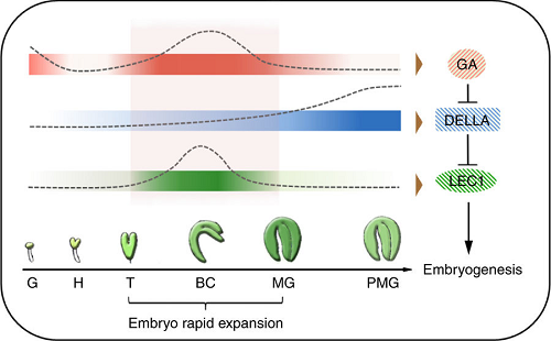 中国科学院华南植物园侯兴亮研究组发现,在拟南芥胚胎发育过程中,活性赤霉素的合成呈现出先升高后降低的时空特异性变化,并在晚期胚胎膨大阶段达到顶峰。在此时期,赤霉素生物合成或信号转导缺陷都会导致胚胎发育异常,具体表现为胚胎子叶伸展受抑和胚轴缩短。相反,赤霉素过量积累则会导致成熟胚明显变大。进一步研究发现,赤霉素信号负调控因子DELLA可与植物胚胎发育的关键调控因子LEAFY COTYLEDON1(LEC1)相互作用,在胚胎膨大阶段,赤霉素通过降解DELLA蛋白来释放DELLA对LEC1的抑制作用,从而促进胚胎相关基因的表达以及生长素的合成以促进胚胎发育。该研究揭示了赤霉素通过GA-DELLA-LEC1信号模块以一种时空特异的方式调控晚期胚胎发生,阐明赤霉素在胚胎发育中的具体角色,为理解植物激素如何调控胚胎发育提供了新的视角。