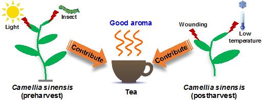 茶树(Camellia sinensis)是我国重要的经济作物,中国是最早发现与利用茶树的国家,至今已有数千年历史;茶也成为全世界的第二大饮料,仅次于净水。与其他植物相比,茶树中次生代谢产物有其独特性,这些物质不仅赋予了茶叶独有的色、香、味品质,而且与人体健康密切相关。多酚、氨基酸和香气是茶叶品质的核心物质。茶叶中含有丰富的多酚类物质(18-36%)和氨基酸物质(1-4%),香气物质(0.005-0.03%)含量相对较低。研究茶叶香气物质的形成具有重要的科学意义,同时为改进茶叶品质提供重要技术支撑。茶叶香气的形成,根据反应类型的不同可分为三种类型,包括茶叶细胞相对活体状态下的酶促反应(存在于茶树生长过程和采后加工的部分阶段,包括基因表达激活与酶和底物反应)、茶叶细胞破碎状态下的酶促反应(存在于采后加工阶段,主要是酶和底物反应)和热物理化学反应(存在于采后加工和深加工阶段)。
