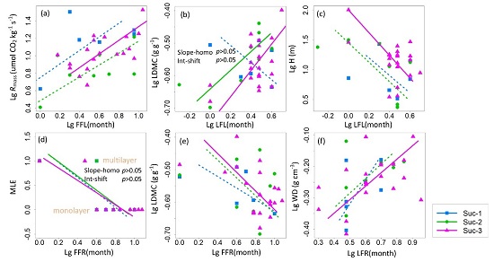 图2.花果物候与其他性状在不同演替阶段的线性关系