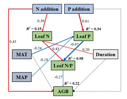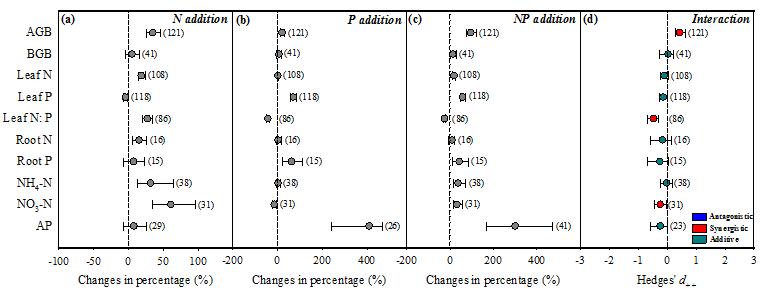 氮、磷是植物生长必需的两种养分元素,氮、磷有效性与植物生长的关系历来都是学者们关注的焦点。传统观点认为,植物生长在高纬地区往往是受氮的限制,而在低纬地区则是受磷的限制。新近研究结果表明,植物生长普遍受到氮磷的共同限制,且这种共同限制会因氮磷交互作用程度与方向的不同而不同,呈现这一结果的研究主要是基于植物地上部分生物量的反应,而对表征植物生长的其它变量与氮磷交互作用的关系并没有得到有效的研究。因此,氮磷交互作用如何通过影响土壤氮磷有效性、植物养分吸收、植物养分浓度以及植物氮磷比,进而影响植物生产力,仍是科学认识上的盲区。