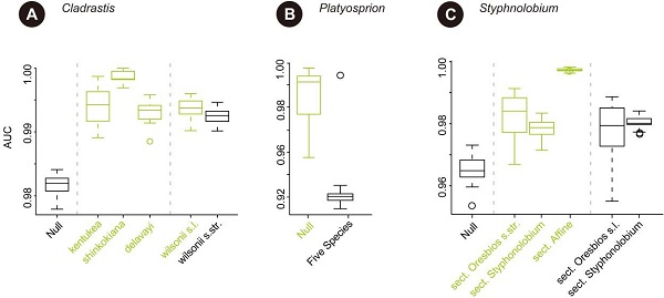 图1. 利用生态位建模法辅助确定香槐属与翅荚槐属的种数,并明确肉果槐属内组的划分
