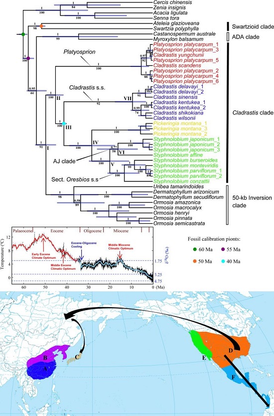 香槐族的分布符合著名的东亚-北美植物间断模式,并且有1个种延伸至南美洲西北部。根据详实的化石记录考证、分化时间推测(图2)、祖先分布区重建以及性状进化分析,我们推测香槐族起源于早始新世的中纬度北美洲,其祖先为落叶乔木,果实形态为具翅扁平荚果(类似翅荚槐属)。在中始新世,具有无翅荚果的类群也从上述祖先类型中分化出来(类似香槐属)。荚果具翅与无翅类群在中始新世至晚始新世均通过白令陆桥迁移至亚洲东北部。随后,在始新世与渐新世的过渡时期,全球气温骤降,这可能导致了翅荚槐属在北美的灭绝,也引起了北美西部旱生灌丛(chaparral)植被类型的出现。植被的改变导致了旱生常绿灌木类群刺枝槐属与中生落叶乔木类群肉果槐属的分化,其中前者的荚果扁平,而后者的果实呈念珠状,并具有肉质中果皮。肉果槐属在随后的渐新世传播至中美洲,并在中中新世迁移至亚洲,国槐即为该属在亚洲的唯一现生种类。