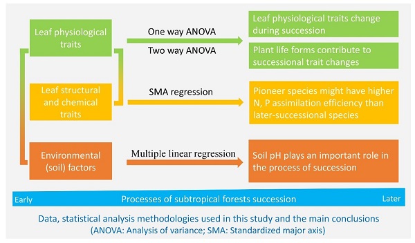 中科院华南植物园生态及环境研究中心博士生韩涛涛在任海研究员等指导下,调查了中国南亚热带森林不同演替阶段优势物种的9种叶片生理性状,7种叶片结构及化学性状。同时,为进一步明确哪种环境因子对于植物叶片生理性状具有显著影响,也调查了不同演替阶段的14种环境因子。结果显示,植物叶片光合作用、呼吸作用、蒸腾速率、叶片光合N元素利用效率以及光合P元素利用效率均随着演替进行显著降低,并且这种变化在很大程度上可由植物的生活型解释。研究还发现叶片生理性状在森林演替过程中与土壤pH值具有较强关联。研究结果表明植物叶片养分利用策略与土壤pH值的相互作用在森林演替过程中发挥着重要作用。土壤pH值可以作为华南地区森林动态演替过程中的一个重要指标。同时,该研究也有助于加深对森林演替过程中植物生存和更新策略的理解。