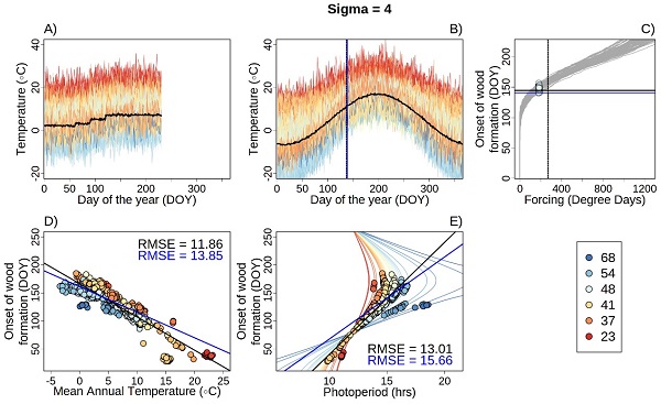 图: 利用过程模型等方法模拟的物候数据及其与主要环境变量的数量关系。