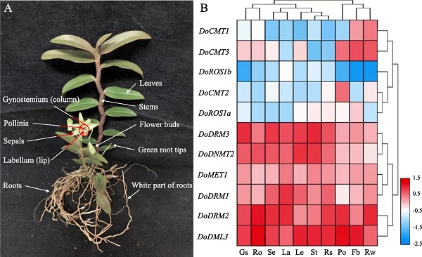 图1. 铁皮石斛DNA甲基转移酶基因(DoC5-MTase)、DNA去甲基化酶基因(DodMTase)在不同组织器官中的时空表达分析。