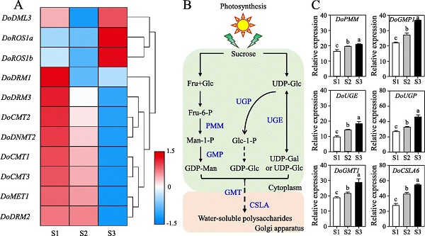 RT-qPCR分析结果显示,在铁皮石斛的生长发育过程中,随着多糖合成关键酶基因(DoPMM、DoGMP1、DoUGP、DoUGE、DoGMT1、DoCSLA6)表达量的增加,铁皮石斛多糖含量显著增加。在此期间,铁皮石斛DoC5-MTase基因显著下调表达,而DodMTase基因明显上调表达,从而使铁皮石斛DNA甲基化水平明显下降,进而促进多糖合成关键酶基因显著上调表达,最终导致铁皮石斛多糖含量明显增加。研究结果表明,表观遗传(DNA甲基化修饰)能够调控铁皮石斛多糖的生物合成,铁皮石斛DNA甲基转移酶(DoC5-MTase)与DNA去甲基化酶(DodMTase)很可能形成平衡式负反馈回路,进而动态调控铁皮石斛多糖的生物合成。