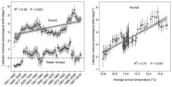 中科院华南植物园生态中心宋柱秋助理研究员,与海南大学及北京师范大学科研人员开展合作,利用多年生兰科草本植物绶草(Spiranthes sinensis)的开花物候数据,调查了气候变暖对开花物候纬度格局的影响。物候数据提取自标本和野外照片,有长达117年(1901-2017)且覆盖了东亚近40个纬度(21°N?60°N),非常适合该主题的探讨。研究结果主要包括:(1)整体上,开花时间随纬度显著变化,平均值为2.93/纬度,即每增加10个纬度,开花时间推迟约1个月;(2)在水分受限制的地区,开花物候与纬度并不存在显著相关性(图),即在相近时间开花,并且也不受气候变暖影响;(3)在湿润地区,开花物候随纬度显著变化,并且气候变暖显著增加了纬度间开花时间的差异,年均温每升高1摄氏度,纬度间开花时间差异将增加2.47/纬度;进一步的分析表明,气候变暖促使湿润区开花物候纬度间差异的增大,很可能是物候温度敏感性的纬度格局所致;(4)此外,气候变暖对开花物候纬度间差异的增大,在低纬度更加显著。这些结果表明,气候变暖对开花物候纬度格局的影响在湿润区和非湿润区存在显著的差异,因此气候变暖将与全球降水的变化协同地影响着植物的开花物候;而气候变暖显著增加湿润区的开花物候纬度间差异,可能会减少不同纬度间种群的基因流,从而加速物种分化,并且在低纬度地区更加显著。