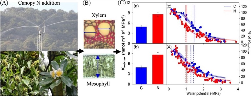中科院华南植物园生态与环境科学研究中心张统博士在叶清研究员的指导下,利用广东石门台林冠模拟氮沉降实验平台,以植物叶片水分关系为切入点,探讨了亚热带森林两种优势树种(锥和木荷) 叶片水力性状对林冠氮添加的响应。研究发现,由于叶片厚度、导管直径和强度的改变,氮添加显著增加了这两种植物的叶片导水率和蒸腾速率,同时降低了叶片的抗旱性。因此,大气氮沉降加剧可能增加森林植物的水分消耗以及植物对干旱的脆弱性。