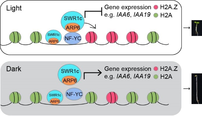 中科院华南植物园农业与生物技术研究中心助理研究员张春雨在侯兴亮研究员的指导下,发现光信号通过NF-YCs促进H2A.Z在下胚轴伸长相关基因位点上的沉降,并抑制光形态建成中下胚轴的伸长。通过一系列蛋白相互作用的实验分析,发现NF-YCs能够与SWR1复合体关键组分ARP6会发生光依赖性的互作。遗传分析表明,NF-YCs和ARP6在光形态建成中作为下胚轴伸长的负向调控因子发挥作用,并且NF-YCs在该进程中的作用部分依赖于ARP6的功能。ChIP-PCR实验结果表明,NF-YCs和ARP6共同调控了它们靶基因位点上的H2A.Z的沉降水平,与遗传分析结果类似,NF-YCs调控H2A.Z沉降主要依赖于ARP6。因此,该项研究揭示了NF-YCs-ARP6这一新的转录调控模块,在光形态建成过程中通过介导H2A.Z在下胚轴伸长相关基因位点上的沉降,并调控其转录表达,从而抑制下胚轴伸长的作用。