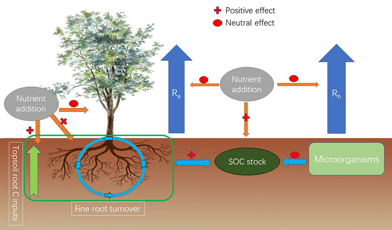研究发现,木麻黄各部分的生长并未受到氮磷施肥的影响,但是氮添加显著增加了枝条中的氮含量。土壤呼吸也未受到施肥措施的影响。因此,施肥措施并未显著影响这些海岸带防护林的固碳能力,但是氮或者磷的添加显著增加了表层土壤中的有机碳。尽管土壤呼吸均未受到施肥的影响,但是由于木麻黄的细根为了吸收表面的营养物质,会在土壤表层形成更多的细根,同时细根的周转率提高,使土壤表面的有机碳含量增加,从而提高表层土壤有机碳(图2)。他们进一步通过与其他生态系统进行比较,发现海岸带木麻黄林在构建初期固碳能力具有很明显的优势。其结果表明,氮磷添加虽然没有增加木麻黄人工林的固碳能力,但是使土壤中的碳含量增加,这可以改善海岸带生态系统的土壤状况,为其他植物生长提供物质基础。总体上,该研究表明幼龄木麻黄林能够在海岸带贫瘠的土壤中健康成长,并且在没有外来营养物质输入的情况下依然具有很强的固碳能力。