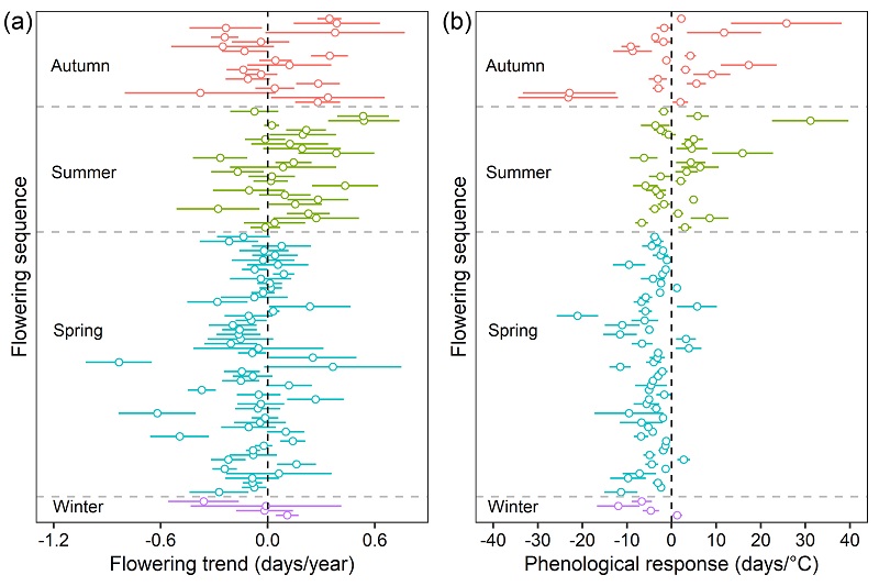 结果表明,多数春季开花物种和冬季开花物种的物候提前,多数夏季开花物种的物候推迟,而秋季开花物种推迟和提前的物种数相当;在整体上,春季开花物候显著提前,夏季开花物候显著推迟,而秋季和冬季开花物候则没有显著变化。不同季节开花的物种对温度变化的响应也差异较大,春季和冬季开花物种的物候普遍随温度升高而提前,而在夏季和秋季开花物候则随温度升高而提前和推迟的物种数相当(图)。进一步的分析表明,南岭地区的春季开花物候的提前与当年早春温度(2-3月的平均气温)和上一年晚夏至早秋温度(8-10月的平均气温)显著相关,并且后者效应几乎是前者效应的2倍(-4.7 vs. -2.5 days/°C)。晚夏至早秋温度对南亚热带地区春季物候的这种强效应显著不同于温带地区,而区分温带和亚热带地区之间的物候差异,可能对理解未来气候变化如何影响全球物候变化格局有重要的帮助。因此,该项研究对鉴定温带和亚热带物候对气候变化响应之间的异同有重要作用,并且未来有必要进一步开展亚热带地区的物候研究。