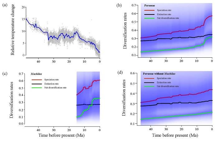 图2. 鳄梨族的分化速率随时间变化。(a)过去45个百万年全球温度变化趋势。(b)鳄梨族分化速率随时间变化。