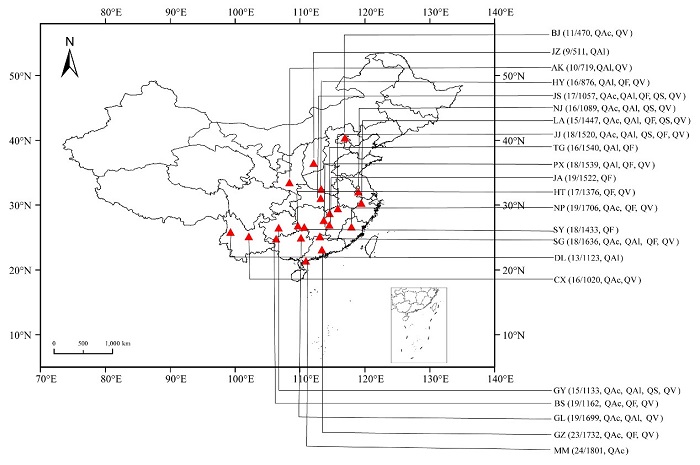 图1. 沿纬度梯度和经度梯度的落叶栎22个采样点。