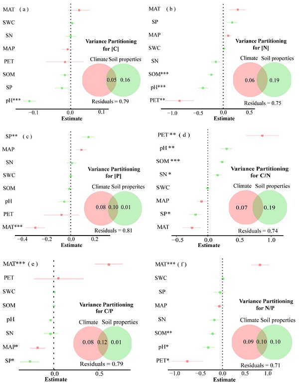 图3. 气候和土壤因子对落叶栎叶片化学计量性状的影响。