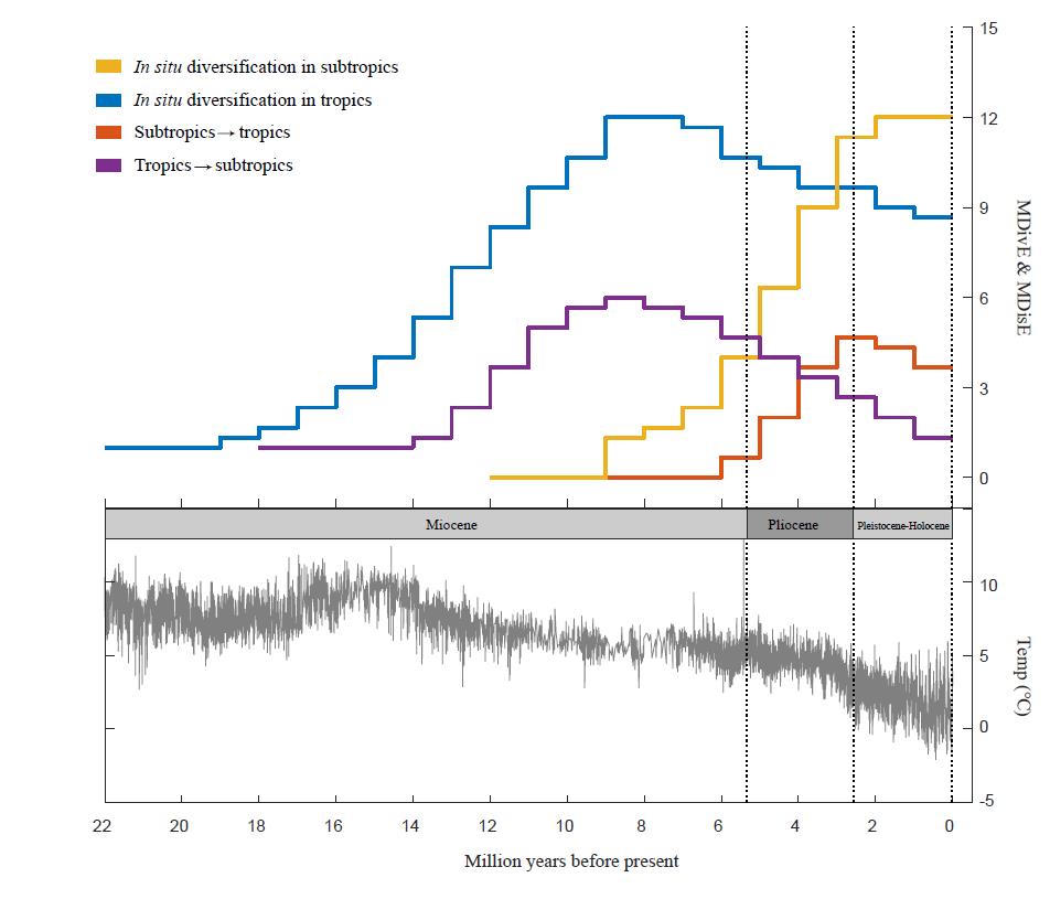 中科院华南植物园植物科学中心分子生态学团队等采用叶绿体基因组重建了含笑组的演化历史,解析出热带与亚热带含笑物种本地积累的演化速率及双向迁移速率(图1)。科研人员发现:含笑组与玉兰组的分化发生在渐新世晚期,应与现代季风的起源有密切联系;热带地区的含笑物种较为古老,且演化速率及向亚热带的迁移率在中新世中晚期(~8 Ma)达到峰值,此后呈下降趋势,暗示该时期的环境变化(如季风减弱、气候干旱)对含笑物种的演化产生了重大影响;亚热带地区的含笑物种在中新世中晚期(~8 Ma)开始产生并快速分化,并在更新世之后(~3 Ma)向热带迁移的速率呈现下降趋势,暗示该事件与全球的重要环境转型事件存在关联(如第四纪冰期、季风波动频率加强等)。总之,该研究表明重要的环境转型深刻地记录在现生生物的分布格局与DNA中,为揭示亚洲生物多样性特别是东亚常绿阔叶林植物多样性与气候变化的规律提供了案例。