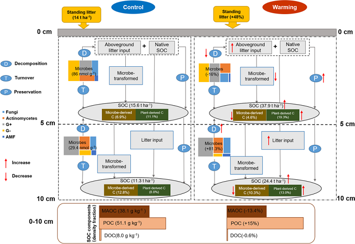 图2. 长期增温影响土壤有机碳含量和组成的微生物转化和矿物保护途径