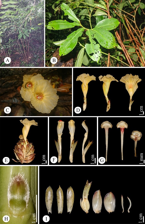 基于上述研究结果,该团队建立了一新属——地莴笋花属(Parahellenia N.H. Xia, Juan Chen, L.Y. Zeng & S.Jin Zeng, gen. nov.)以放置莴笋花属花序基生的成员。通过全面的标本整理和野外考察,团队成员系统地研究了地莴笋花属植物,结果表明该属目前共有6种,除先前发表的4种需要重新组合之外,还发表了2个新种。该研究澄清了莴笋花属的系统发育关系,为未来亚洲闭鞘姜科的全面分类修订奠定了基础。