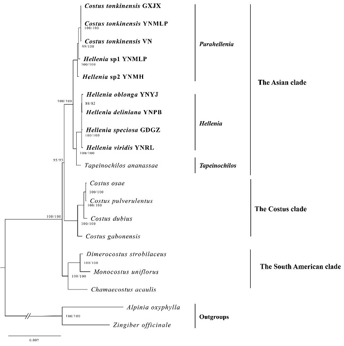 图3. 基于叶绿体组编码基因构建的闭鞘姜科系统发育树。
