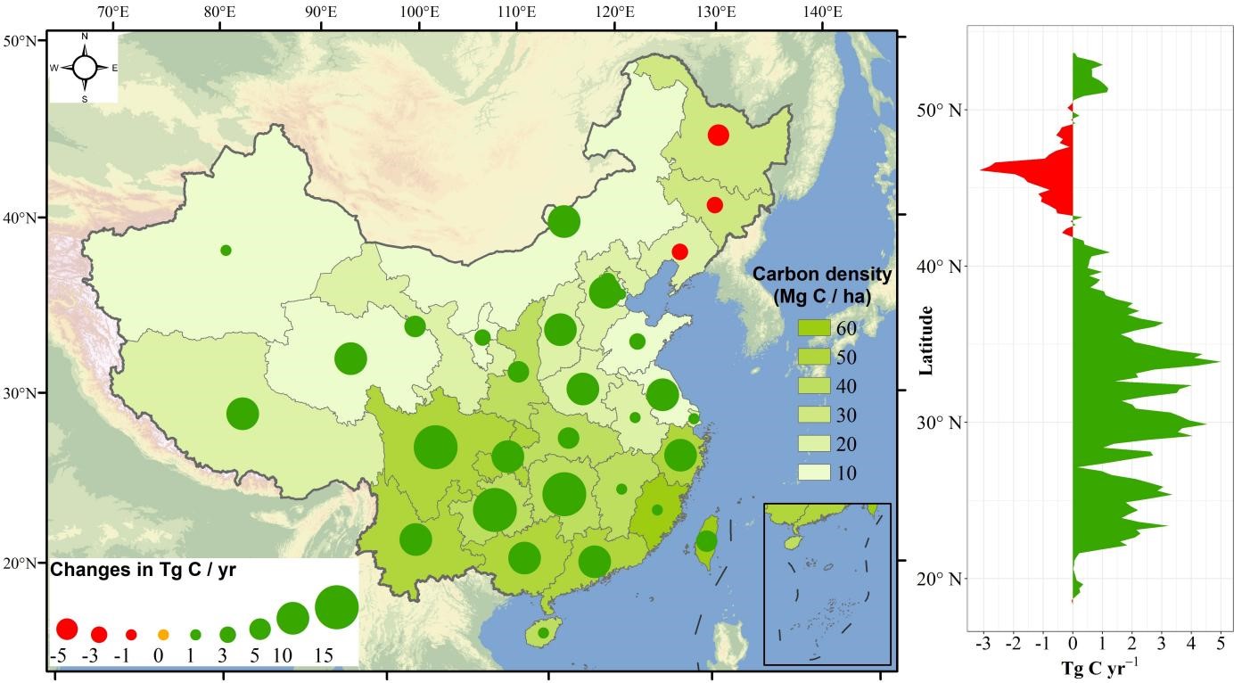 随着国家林业重点工程的实施,我国森林在过去几十年间扮演着碳汇功能,对区域和全球碳平衡贡献显著。在全球变化背景下,陆地生态系统,尤其是森林的固碳能力将继续发挥重要作用。为了满足我国森林碳汇的科学管理和应对我国“双碳目标”的科学评估,急需摸清我国森林碳储量空间分布和变化规律。