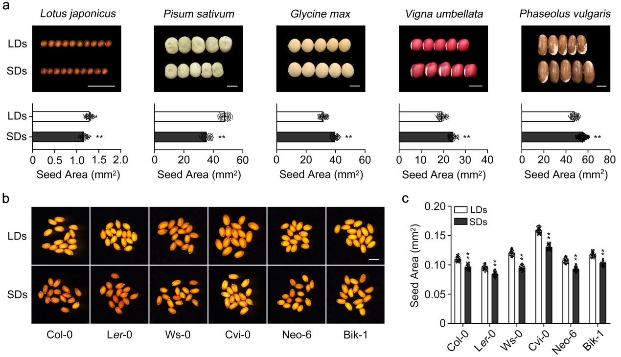 根据成花转变对不同日照长度的响应,光周期敏感植物主要分为长日照(Long Days,LDs)诱导开花的长日照植物和短日照(Short Days,SDs)诱导开花的短日照植物。为探索光周期是否影响植物种子的发育,研究者选取六种具有不同光周期特性的植物,包括长日照植物百脉根(Lotus japonicus)、豌豆(Pisum sativum)和拟南芥(Arabidopsis thaliana)以及短日照植物大豆(Glycine max)、红小豆(Vigna umbellata)和菜豆(Phaseolus vulgaris),并观测其在不同光周期条件下的种子表型。有趣的是,三种长日照植物(百脉根、豌豆和拟南芥)和三种短日照植物(大豆、红小豆和菜豆)分别在LDs和SDs下产生更大的种子,与其各自的光周期开花特性一致。