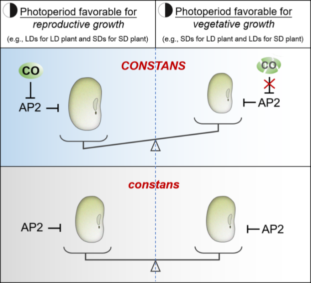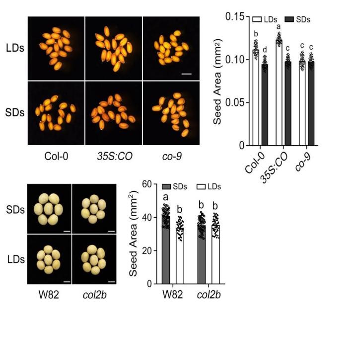 以长日照植物拟南芥和短日照植物大豆进行深入研究,发现当光周期响应因子CONSTANS (CO)发生突变时,植株在不同光周期下会产生同样大小的种子,即种子大小发育的决定失去对光周期的敏感性,表明CO在光周期调控种子发育中具有关键作用。对拟南芥光周期途径中CO上游的生物钟基因及光受体基因突变体的表型观测,以及通过一系列光周期转移实验进一步确定了CO在介导光周期信号调控种子大小中的核心功能。之后,通过转录组、基因表达、遗传分析及细胞学观察,他们发现种子发育负调控基因APETALA2(AP2)是CO的重要靶基因。在LDs下培养的拟南芥以及SDs下培养的大豆中,CO直接抑制AP2的转录,以光周期依赖的方式调控种子大小。进一步分析发现,CO-AP2通过调控种皮表皮细胞增殖以母本依赖的方式发挥功能。
