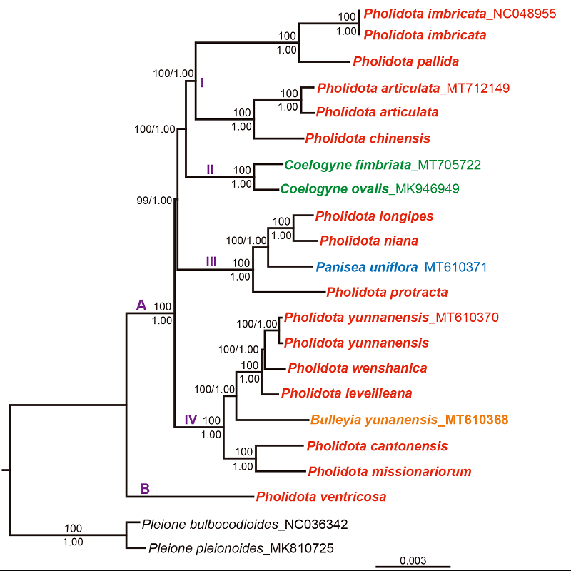 在综述之前工作的基础上,该研究基于叶绿体全基因组序列进一步探讨了石仙桃属及其近缘属之间的系统发育关系,结果表明,传统意义上依据唇基囊状界定的石仙桃属为多系,分为四个主要分支(1):狭义石仙桃属(Pholidota s.s)与包含贝母兰属(Coelogyne Lindl.)部分代表物种的一个分支构成姊妹群;另外两个分支分别与蜂腰兰属(Bulleyia Schltr.)和曲唇兰属[Panisea (Lindl.) Lindl.])的代表物种聚在一起; P. ventricosa偏离该属所有其他物种,稳定处于系统发育树的基部。尽管唇基凹陷的性状在石仙桃属物种间表现出相似性,但经历了多次独立进化而产生,为非同源性状,而石仙桃属多数分支得到子房是否被毛、花苞片形态等形态共衍征的支持。
