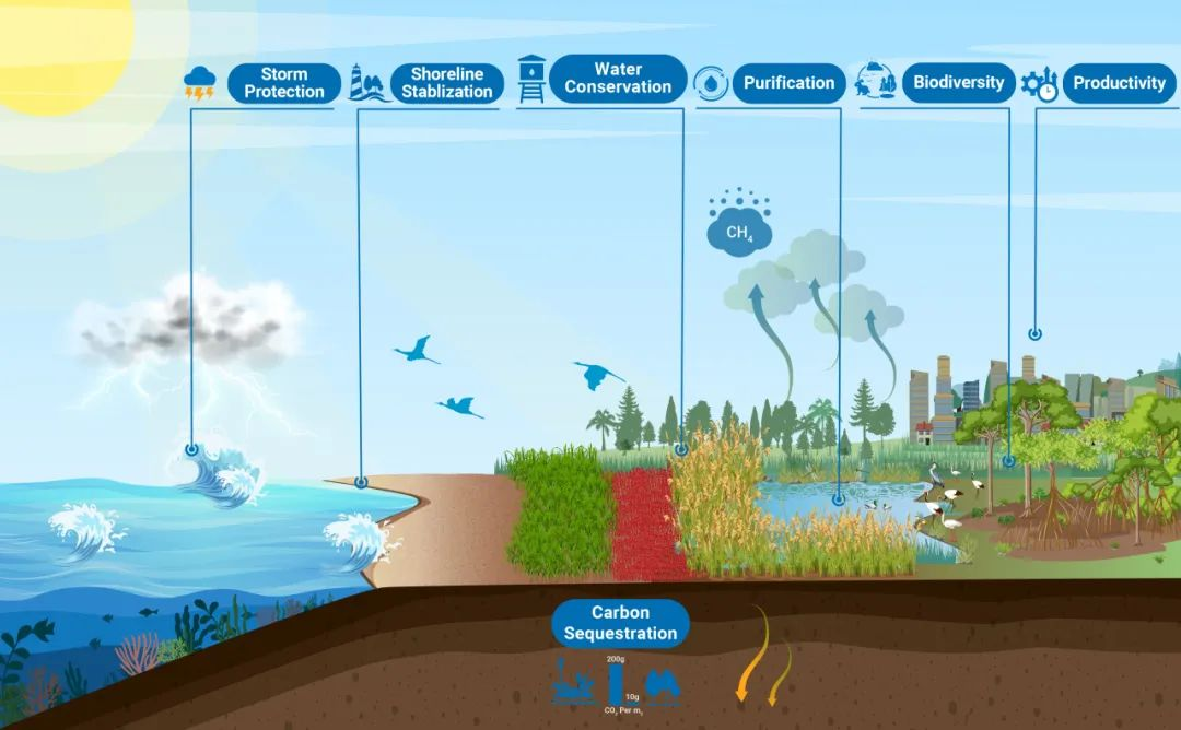 除了碳汇功能,这些海岸带蓝碳生态系统还具有重要的生态功能,对社会提供许多益处,如提供栖息地、调节和稳定气候、净化水质、保护水源、防洪、岸线稳定、具有丰富生物多样性和高生产力等服务功能。这些生态系统服务的价值约为每公顷每年22万人民币。